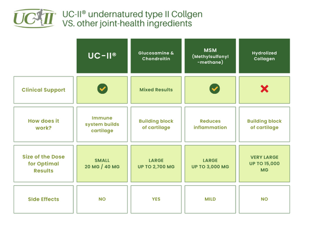 Type II Collagen (UC-II) forms the main structure of cartilage tissue. Even at the smaller dosages, UC-II has also been reported to be more effective than glucosamine and chondroitin sulfate supplements, which are the supplements most frequently used in the market. Clinical studies show UC-II to be significantly more effective than glucosamine + chondroitin for joint comfort and flexibility, helping the immune system build the cartilage instead of building a block of cartilage. Furthermore, the dose of product required in the UC-II case is much smaller, providing an ease of administration for the treatment. Lastly, UC-II is allergen free, opposite to glucosamine.