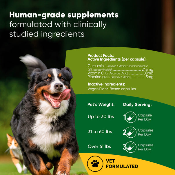 Turmeric is provided in small, neutral-flavored capsules designed for ease of administration. The capsule size and neutral profile support consistent daily supplementation and help make routine use simple and stress-free for pet owners. For questions about integrating this supplement into your pet’s daily routine, your veterinarian can provide personalized guidance.